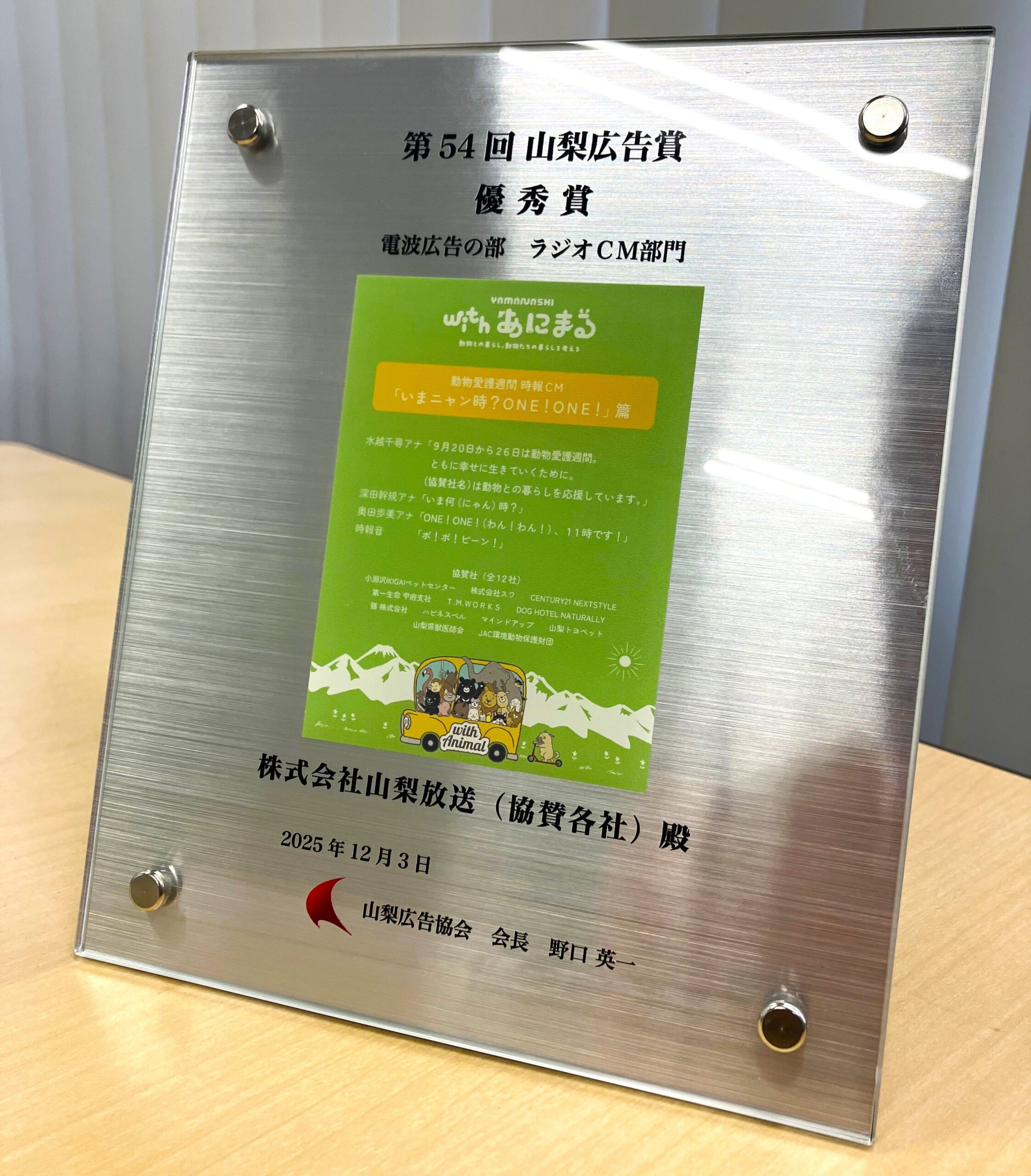 小淵沢IKIGAIペットセンターも協賛させて頂いた、「山梨withあにまる」キャンペーンの時報ラジオCMが第54回 山梨広告賞のラジオ部門で優秀賞を受賞しました! これからも動物との暮らしや動物たちの暮らしを応援していきます。